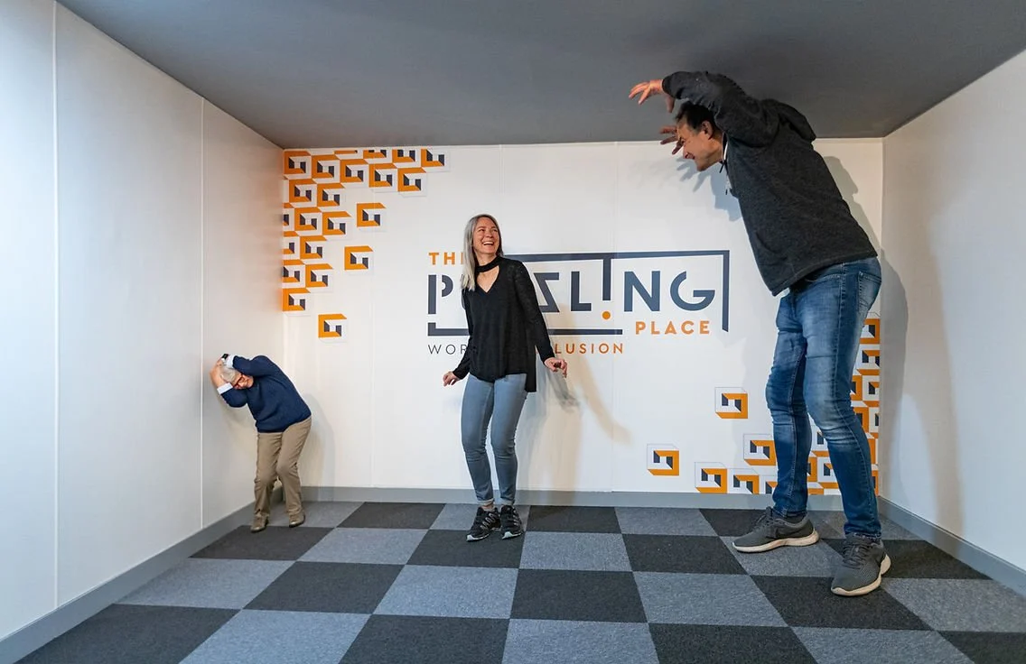 The Ames illusion (above) illustrates how the Cartesian grid of a ‘normal’ room helps judge the depth, shape and position of objects.